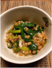 ■今月のレシピ ~栄養満点 ニラ納豆~ 野菜がたくさんが入りますが、納豆に付属されたタレと酢でちょうど良い味になります。酢の酸味が納豆のうまみを引き立て、さらに油を加えることでマイルドな口当たりに